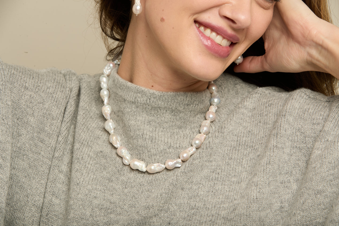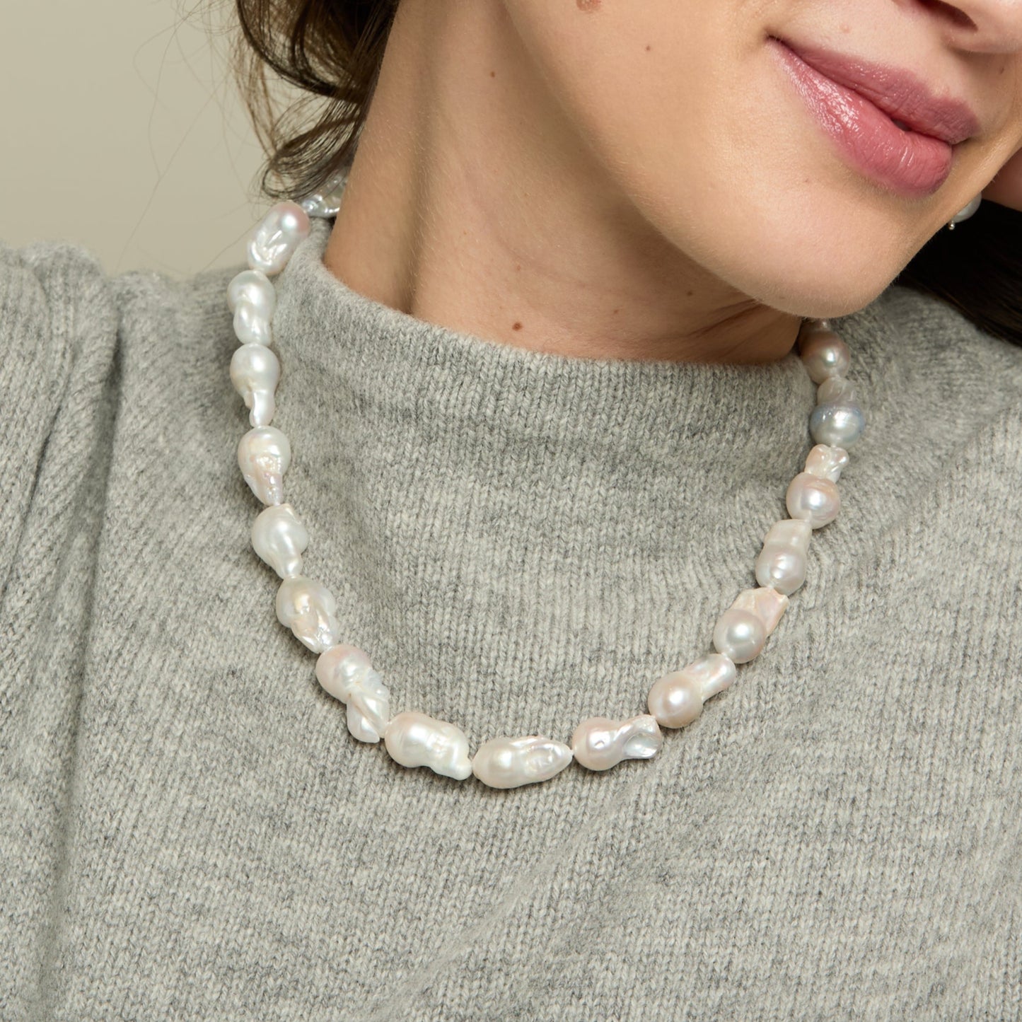 Ideal: A stunning cultured freshwater 'fireball' pearl necklace. Named after their organic arresting irregular shape - these exquisite pearls are a definite showstopper. These stunning pearls are strung with a beautiful pave clasp that sparkles with every twist and turn.